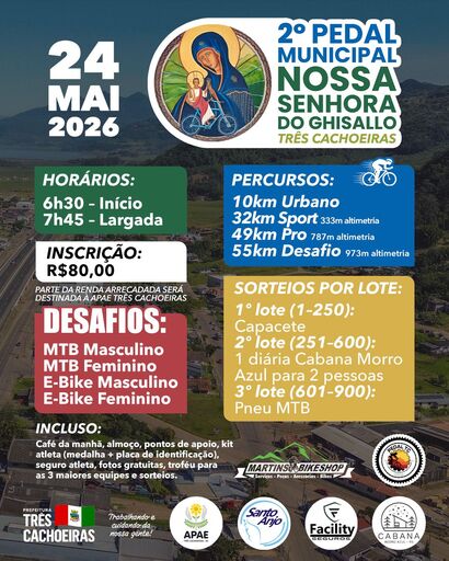 A Associação de Ciclistas de Três Cachoeiras (ACTC), com apoio da Prefeitura Municipal, realiza no dia 24 de maio o 2º Pedal Nossa Senhora do Ghisallo. O evento terá início às 06:h30, com largada prevista para 07:h45, reunindo ciclistas de diferentes modalidades e níveis de experiência na cidade. Parte da renda arrecadada será destinada à Apae Três Cachoeiras.