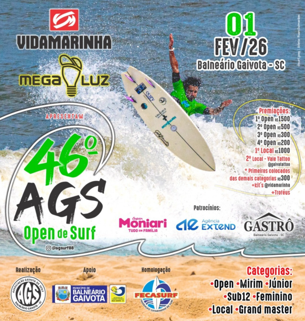 O 46º AGS Open de Surf, apresentado pela Vida Marinha e Mega Luz, tem patrocínio de Super Moniari, Gastrô e Agência Extend e apoio da Prefeitura de Balneário Gaivota.