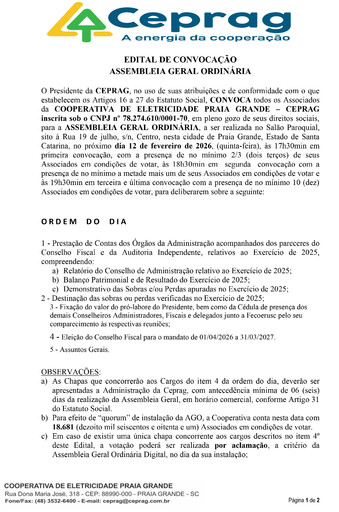 A CEPRAG realizará Assembleia Geral Extraordinária (AGE) e Assembleia Geral Ordinária (AGO) no dia 12 de fevereiro de 2026, no Salão Paroquial, em Praia Grande. Confira os editais.