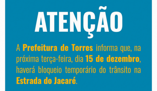 A Prefeitura de Torres informa que na próxima segunda-feira, 15 de dezembro, haverá bloqueio de trânsito na Estrada do Jacaré. A intervenção é necessária para a drenagem prevista para o local.
