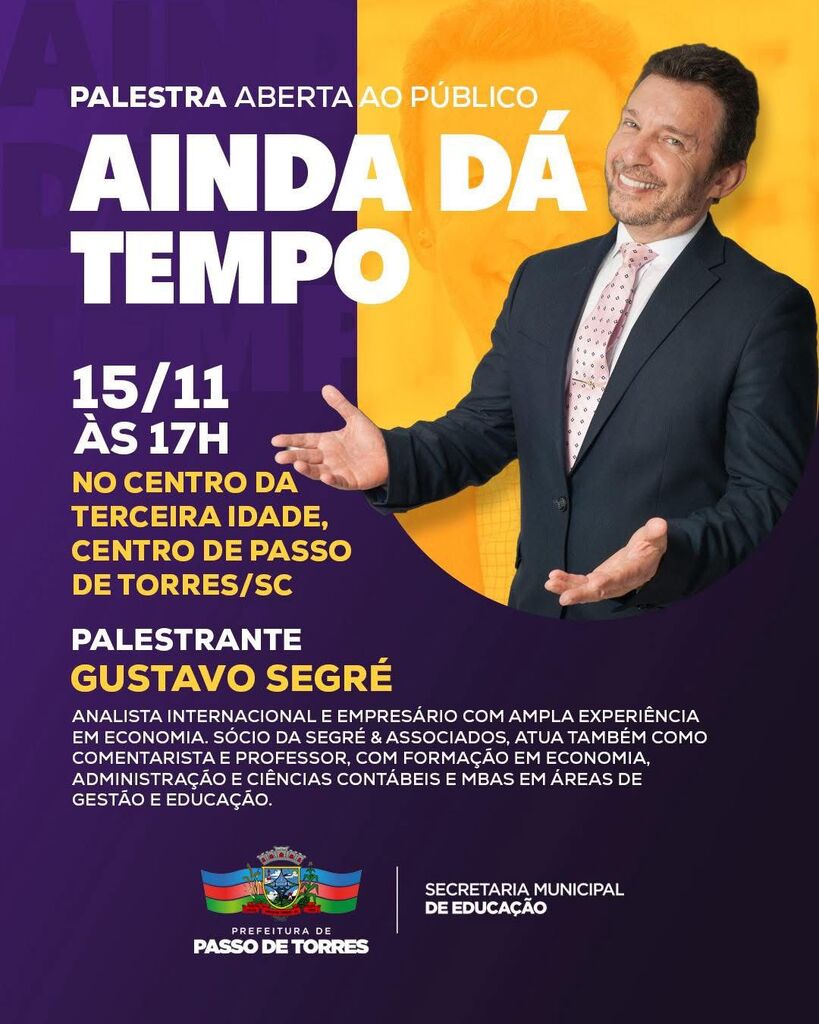 PALESTRA “AINDA DÁ TEMPO” SERÁ REALIZADA EM PASSO DE TORRES NO DIA 15 DE NOVEMBRO |
