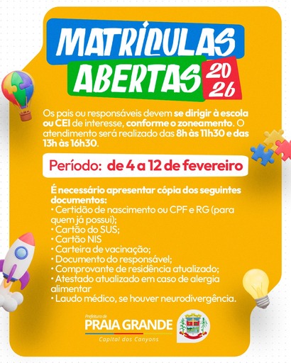 A Prefeitura Municipal de Praia Grande informa que as matrículas para 2026 na Rede Municipal de Ensino estão abertas nas escolas e CEIs do município, de 04 a 12 de fevereiro, das 08h às 11h30 e das 13h às 16h30.