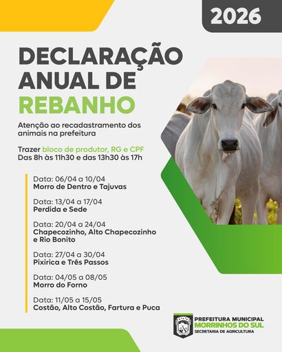 A Prefeitura de Morrinhos do Sul, por meio da Secretaria Municipal de Agricultura, inicia no dia 6 de abril o cronograma da Declaração Anual de Rebanho. A ação será realizada em diferentes localidades do município, conforme calendário definido, com atendimento das 8:00h às 11:h30 e das 13:h30 às 17:00h.