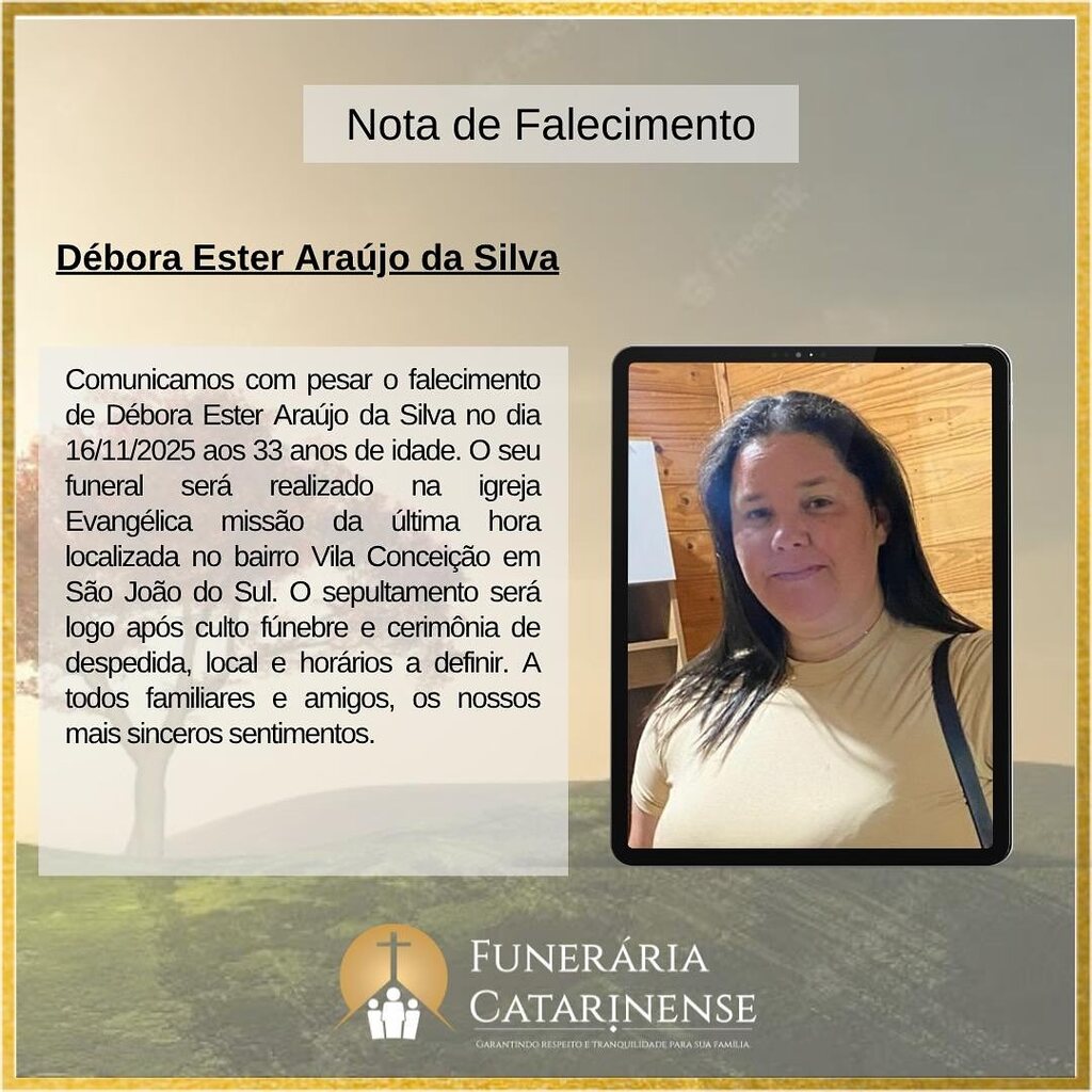 A vitima se chamava Debora Ester Araujo da Silva e seu corpo foi velado na Igreja Missão da Última Hora de Vila Conceição, São João do Sul sobre a comoção da família e da comunidade.