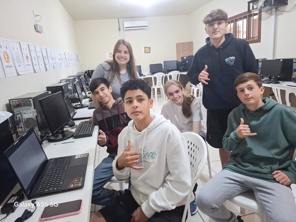 Ainda na mesma escola, os alunos Thomaz, Henrique, João Vitor, Pedro e Lucas do 8° ano, reuniram-se com a professora Katrine para representar o Município no Desafio Intermunicipal de Educação Fiscal, apresentando uma paródia criativa sobre o tema.