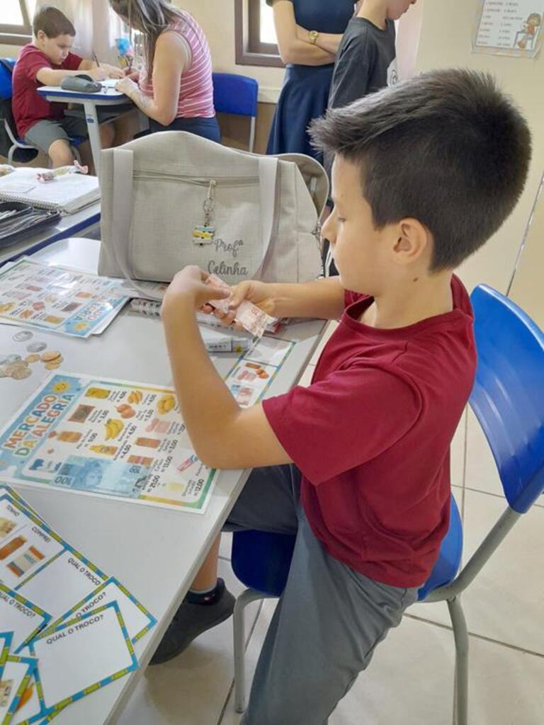 Na Escola Afonso Bedinot, os alunos do 3° ano, acompanhados pela professora Celinha, participaram da atividade “Mercado da Alegria”, que proporcionou uma experiência prática com o sistema monetário brasileiro. De forma lúdica e divertida, os estudantes aprenderam sobre cálculo, uso adequado do dinheiro e organização do troco, compreendendo sua importância no dia a dia.