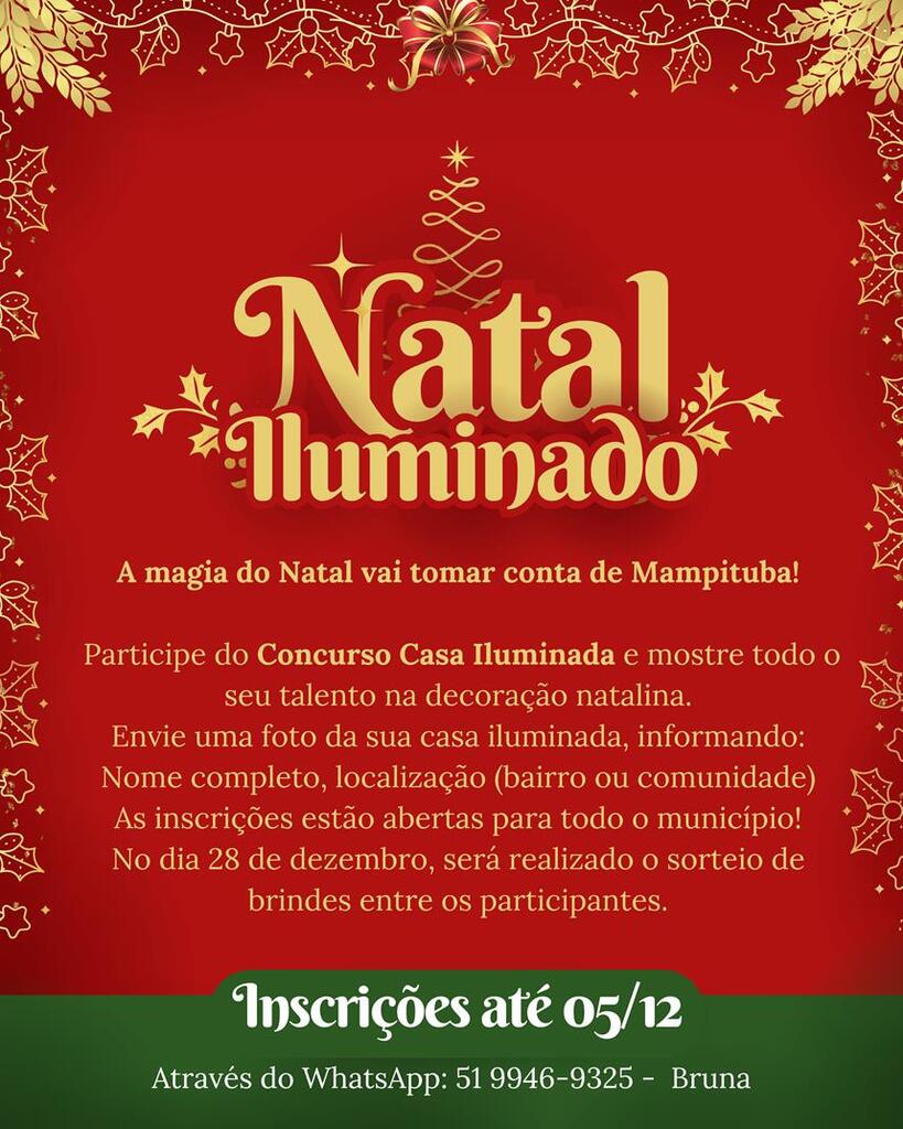 A magia do Natal já está chegando a Mampituba, e a Administração Municipal convida toda a comunidade a participar do Concurso Casa Iluminada, uma iniciativa que busca valorizar o espírito natalino e transformar o Município em um verdadeiro cenário de luzes e encantamento.