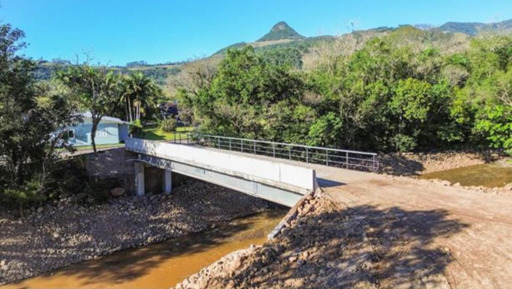 A Prefeitura de Morrinhos do Sul concluiu neste mês a reconstrução da ponte de Vila Três Passos. A nova estrutura conta com vão único e viga metálica, e foi elevada à altura máxima possível para assegurar a passagem de veículos mesmo em períodos de cheia.