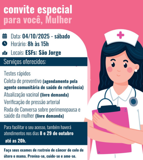 A Prefeitura de Torres, por meio da Secretaria de Saúde, convida todas as mulheres do Município para participarem de uma ação especial de cuidados à saúde das mulheres no próximo sábado, dia 04 de outubro de 2025, na ESF São Jorge, das 08:00h às 15:00h.