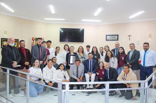 Os alunos Arthur Gomes e Ester falaram sobre o projeto e agradeceram a homenagem dos vereadores. “O projeto Lagoa de Sombrio: um legado em risco”, é uma iniciativa que mobilizou nossa escola ao longo de todo o ano letivo de 2025 e promoveu diversas ações de conscientização sobre a situação da nossa lagoa” destacaram os alunos que também compartilharam a experiência única de ter sido escolhidos para representar a escola nas etapas regional, estadual e nacional, em Brasília.