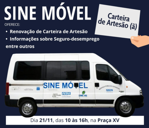 Na sexta-feira, 21 de novembro, o Sine Móvel, van do Sistema Nacional de Emprego, estará em Torres. A Unidade Móvel ficará instalada na praça XV de novembro. A van permanecerá no local, das 10:00h às 16:00h. O propósito do projeto é esclarecer dúvidas dos trabalhadores que poderão solicitar informações junto aos servidores do Sine Móvel, da Fundação Gaúcha do Trabalho e Ação Social.