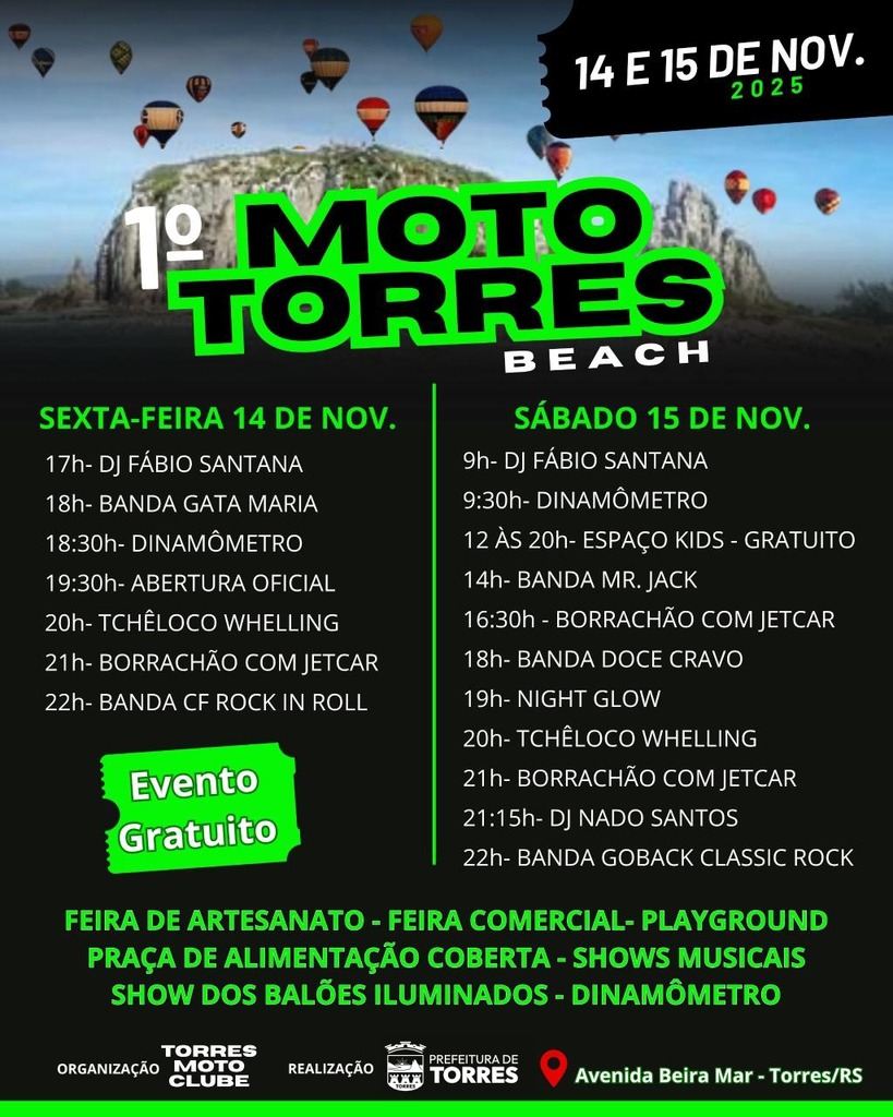 Entre as atrações confirmadas estão as apresentações radicais do grupo Tchê Loco Wheeling, o já tradicional borrachão com JetBlack, e o emocionante Night Glow, que trará balões iluminados colorindo o céu de Torres em um espetáculo visual imperdível.