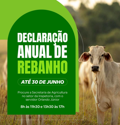 A Prefeitura de Três Cachoeiras informa que está aberto o prazo para a entrega da Declaração Anual de Rebanho 2026. O período iniciou em 1º de abril e segue até 30 de junho, com atendimento disponível na Secretaria Municipal da Agricultura, no setor da Inspetoria, em Três Cachoeiras.