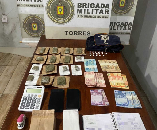 Durante operação integrada Fronteiras e Divisas Seguras em Torres, após fuga de uma tentativa de abordagem, uma guarnição abordou um veículo Renault Sandero e prendeu um homem de 28 anos e uma mulher de 47 anos. No interior do automóvel foram encontradas 15 porções de maconha e 16 cocaína já fracionadas para venda, além de dinheiro, celulares e um caderno de anotações do tráfico.