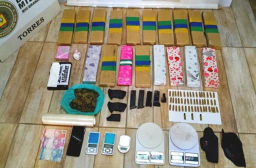 Com o homem foram apreendidos 18 tabletes de maconha, totalizando 14,950 quilos, um tijolo pequeno da mesma droga pesando 250 gramas e uma sacola contendo 2,225 quilos de maconha, além de uma pedra de crack com 48 gramas e um tijolo de cocaína pesando aproximadamente um quilo. Também foram encontradas 52 munições calibre .38, dois coldres velados, quatro carregadores de pistola, duas coronhas de revólver, um municiador, três balanças pequenas, duas balanças médias, um cinto de guarnição com coldre de pistola, R$ 17, um telefone celular e um rolo de plástico filme.