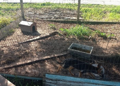 O cão adulto encontrava-se amarrado a uma estrutura de bambu (taquareira), com corrente enrolada, restando aproximadamente 30 cm de mobilidade, sem acesso a água e alimento, apresentando estado de magreza acentuada, com costelas visíveis. Já os filhotes estavam acondicionados em cercado inadequado, sem água limpa e sem ração disponível, com abrigo incompatível com o porte do tamanho dos animais, apresentando sinais aparentes de desnutrição. Já o cão de pequeno porte encontrava-se igualmente amarrado por corrente, com abrigo improvisado com telhas, dispondo de água turva e ração em estado impróprio para consumo, apresentando mofo.