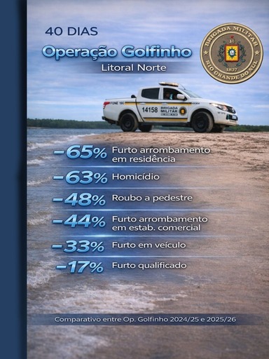 A Brigada Militar apresentou resultados expressivos nos primeiros 40 dias da 56ª edição da Operação Golfinho, realizada no Litoral Norte do Rio Grande do Sul. A ação, que reforça o policiamento ostensivo durante o período de maior circulação de moradores e turistas, registrou queda significativa nos principais indicadores de criminalidade em comparação com a edição anterior.