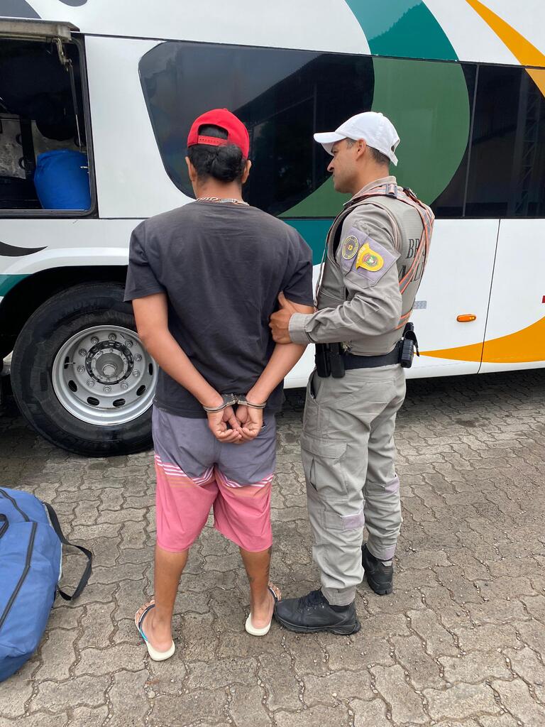 Durante a verificação dos passageiros, foi localizado o suspeito, que possuía mandado de prisão ativo pelo crime de tráfico de drogas.