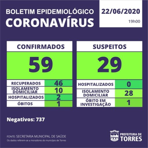 No mais recente Boletim Epidemiológico divulgado pela Secretaria Municipal de Saúde às 18:00h desta segunda-feira, 22 de junho, sobre a COVID-19 em Torres, estão registrados, contando desde o início da pandemia, 59 casos confirmados, com 46 recuperados, dois pacientes em tratamento hospitalar, dez em isolamento domiciliar e um óbito. O fato de constar na mesma ocasião novo caso da doença e já curado, é porque o exame foi realizado em laboratório particular e este ter informado à Secretaria Municipal de Saúde do caso, somente depois do paciente estar tratado.