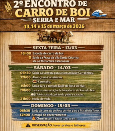 A Prefeitura de Passo de Torres em parceria com a Administração Municipal de São João do Sul e o Grupo Amigos do Carro de Boi realizam neste final de semana, nos dias 13, 14 e 15 de março, o 2º Encontro de Carro de Boi "Serra e Mar". O encontro que reúne carros de bois de Praia Grande, São João do Sul e Passo de Torres inicia na sexta-feira (13) com a saída dos carros de boi com escolta às 16:00h de Vila Santa Catarina até o CTG Porteira Catarinense no centro de São João do Sul. No sábado (14), às 05:30 haverá partida da carreata em direção a Curralinhos, Passo de Torres com almoço às 12:00h e às 15:00h seguimento da carreata até Balneário Rosa do Mar, onde às 20:00h haverá o Jantar de Recepção do grupo e às 21:00h enceramento das atividades do dia com show de moda de viola. Já no domingo (15), às 08:00h terá carreata até Bellatorres onde acontece a recepção dos carreiros pelos veranistas e moradores e em seguida volta até Balneário Rosa do Mar, onde será realizado o almoço de confraternização e encerramento do encontro.