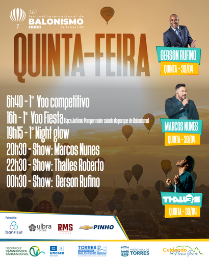 O festival abre com voo competitivo às 6h40 desta quinta-feira. À tarde, às 16h, acontece o 1° Voo Fiesta, disputando a Taça Antônio Pompermaier, com saída do próprio Parque de Balonismo. Ao anoitecer, às 19h15, os balões iluminam o céu no 1° Night Glow. A noite musical começa às 20h30 com Marcos Nunes, seguido por Thalles Roberto às 22h30 e Gerson Rufino às 0h30.