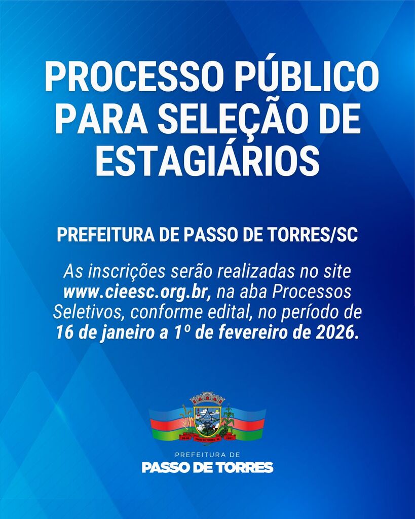 A Prefeitura de Passo de Torres/SC publicou edital de processo público para seleção de estagiários que irão atuar nas secretarias municipais. As inscrições começam no dia 16 de janeiro e seguem até 1º de fevereiro de 2026, exclusivamente pelo site do Centro de Integração Empresa-Escola de Santa Catarina (www.cieesc.org.br).